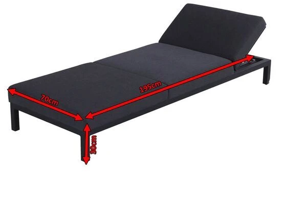 Sie bietet mit ihren Maßen von ca. 195 x 70 x 30 cm ausreichend Platz zum Entspannen und ist dabei besonders komfortabel und hautsympathisch. Außerdem kann sie sich durch ihre zahlreichen technischen Vorteile von herkömmlichen Outdoor-Liegen abheben und daher zum langlebigen Begleiter auf Ihrer Terrasse werden, an dem Sie viele Jahre Freude haben werden. Die Liegefläche ist komplett mit dem Sunbrellastoff in der klassischen Farbe „Schwarz“ überzogen, welche der allgemeinen Sunbrellafarbe „Sooty“ entspricht und zu allen Möbeln in dieser Farbe kombiniert werden kann. Dies wird optisch durch das ebenfalls schwarze Aluminiumgestell perfekt ergänzt. Die Rückenlehne ist 3-fach verstellbar oder kann komplett waagerecht gestellt werden. Außerdem verfügt die Liege über kleine Rollen, sodass sie je nach Bedarf beispielsweise einfach vom Schatten in die Sonne gezogen werden kann und für zusätzlichen Komfort sorgt das im Lieferumfang enthaltene komfortable Kopfkissen.