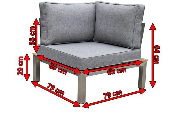 Das Eckelement hat Maße von ca. 79 x 79 x 64 cm und lädt mit einer Sitzhöhe von ca. 29 cm zum Entspannen ein. Die Sitzbreite und -tiefe betragen je ca. großzügige 69 cm. Die Höhe der Rückenlehne des ca. 16 kg schweren Eckelements beträgt ca. 35 cm. Das Eckelement wird zerlegt bei Ihnen angeliefert. Dank der einfachen Montageanleitung ist der Aufbau schnell erledigt und das Eckelement einsatzbereit.