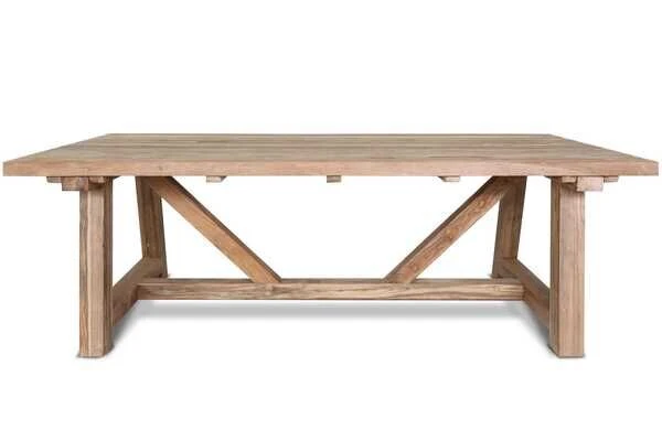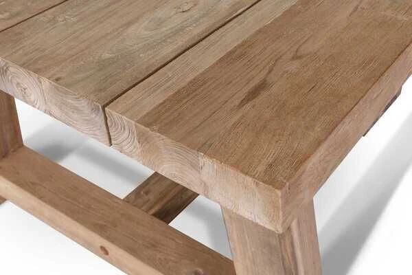 Er benötigt nicht viel Schnickschnack um selbst den anspruchsvollsten Gartenliebhaber zu überzeugen. Das verwendete recycelte Teakholz verleiht diesem Tisch einen ganz besonderen Charme. Die rustikal gebürstete Oberfläche sorgt dafür, dass die natürliche Struktur des Holzes erhalten bleibt und die Maserung besonders gut zum Vorschein kommt. Das Zusammenspiel aus dieser rustikalen Oberfläche und dem im Landhausstil gefertigten Gestell, verleiht dem Tisch sein besonderes Aussehen und sorgt dafür, dass er sich zu nahezu jeder Garteneinrichtung harmonisch kombinieren lässt. Mit den Maßen von ca. 220 x 110 x 76 cm bietet er ausreichend Platz für 8-10 Personen. Die Stärke der Tischplatte von ca. 4 cm und die extra dicken Tischbeine und Querstreben unterstreichen das rustikale Design zusätzlich.