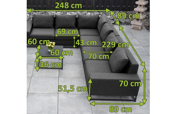 Diese komplette Premium-Loungegruppe von OUTFLEXX® aus einem 3-Sitzer-Element links(ca. 229 x 89 x 70 cm), einem 3-Sitzer-Element mit Armlehne rechts (ca. 248 x 89 x 70 cm) und zwei Kaffeetischen (ca. 60 x 60 x 36 cm) bietet bis zu sieben Personen bequem Platz. Der Oberstoff in der Sunbrellafarbe sooty 3758 unterstreicht den einzigartigen Charakter der Möbel. Für das Gestell wird robustes, pulverbeschichtetes Aluminium verwendet, welches mit der Schaumstoff-Sunbrella Kombination eine solide Sitzmöglichkeit bietet.