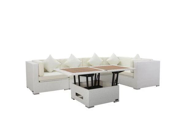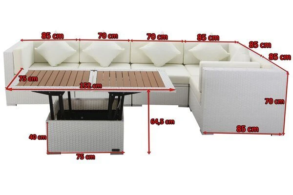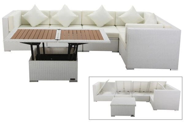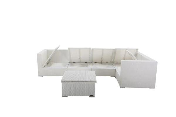 Individuelle Möglichkeiten: Gartenlounge mit Kissenboxfunktion inkl. höhenverstellbaren Loungetisch aus weißem, flachen Polyrattan