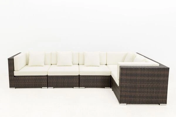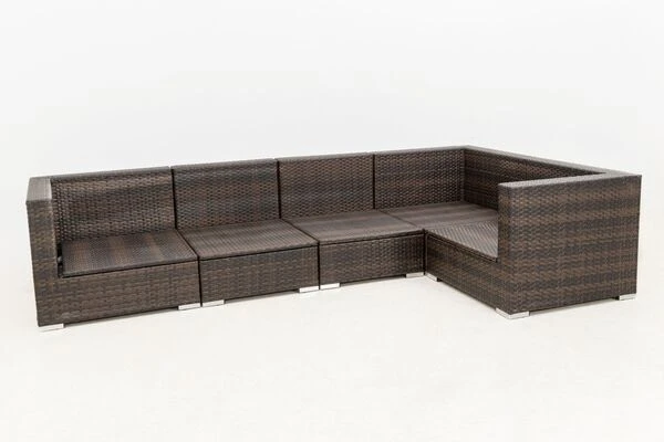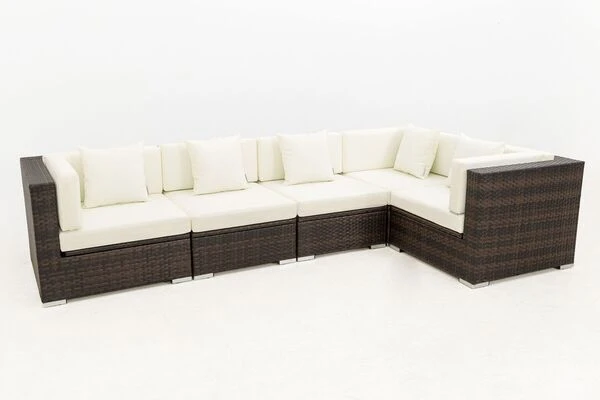 Diese gemütliche Loungegruppe besteht aus 5 Modulen, die Sie beliebig anordnen können. Sie bestimmen somit selbst, wie sich die Möbel auf Ihrer Terrasse am besten präsentieren. Ihre neuen Gartenmöbel sind äußerst pflegeleicht und strapazierfähig, da die verwendete flache Faser sowohl Hitze und Frost als auch UV-Strahlen, Salzwasser und Chlor unbeschadet hinnimmt und nichts von ihrer ursprünglichen Schönheit einbüßt. Im Inneren befindet sich ein rostfreies Aluminiumgestell, welches für die nötige Stabilität sorgt und aufgrund des geringen Gewichts einen einfachen Platzwechsel ermöglicht. Der Sessel und das Mittelelement sind jeweils mit bis zu ca. 150 kg belastbar. Alle Module verfügen über edle Aluminiumfüße, die dank der Kunststoffnoppen Ihren Bodenbelag schonen und einen schönen Kontrast zur Polyrattanfaser bilden.