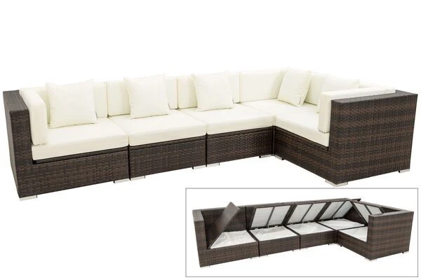Dieses Loungemöbel-Set bietet Ihnen dank seiner ca. 10 cm dicken und bequemen Polsterung besten Komfort, um stundenlang relaxen zu können. Die Polster werden durch wasserabweisende Bezüge aus 100% Polyester (300g/m²) geschützt. Besonderes Extra – Die Sitzflächen der Module lassen sich wie im Artikelbild gezeigt hochklappen und der darunter liegende Stauraum bietet Platz für alle Polster. Dieser Stauraum ist mit einer wasserdichten Kissentasche ausgestattet, die mittels Reißverschluss geschlossen wird. So lassen sich die Polster sicher und platzsparend verstauen.