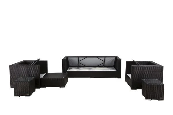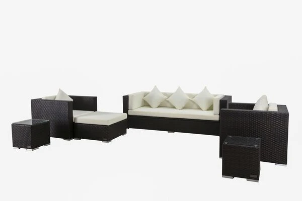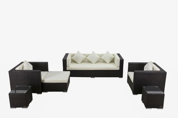 Die Sitzgruppe umfasst ein großes 3-Sitzer-Sofa, zwei Sessel, zwei kleine Beistelltische sowie einen Hocker, den Sie dank der mitgelieferten Glasplatte auch als Tisch nutzen können. Damit ist Ihre Terrasse direkt vollständig ausgestattet. Die hochwertige und wertbeständige Sitzgruppe bietet bis zu sechs Personen einen bequemen Sitzplatz. Hitze und Frost hält die strapazierfähige, flache Polyrattanfaser ebenso stand wie Salzwasser, Chlor und UV-Strahlen. Die Polster der Loungemöbel verfügen über hochwertige Bezüge aus 100% Polyester (300g/m²), die wasserabweisend beschichtet sind und sich angenehm auf der Haut anfühlen.