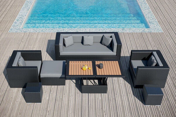 Edel und schön: OUTFLEXX® Polyrattan Loungegruppe inkl. höhenverstellbaren Loungetisch mit Kissenboxfunktion in Schwarz für 6 Personen