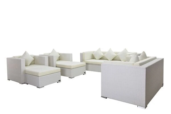 Dieses umfangreiche Gartenmöbel Set von OUTFLEXX® aus weißen Polyrattanfasern bietet bis zu neun Personen einen Sitzplatz und ist damit perfekt für Gartenpartys geeignet.