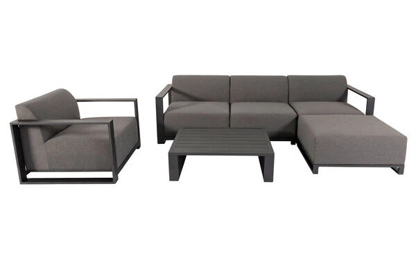 Jede Sitzfläche der modernen Loungegruppe ist mit ca. 64 cm Tiefe und ca. 83 cm Breite großzügig proportioniert und kombiniert mit den luxuriösen Polstern erhalten Sie höchsten Sitzgenuss. Auf der geräumigen Sitzfläche der Ecklounge lässt es sich auch herrlich bei einem Mittagsschläfchen entschleunigen. Und der Hocker bietet nicht nur eine tolle Sitzgelegenheit, er ist auch perfekt zum Hochlegen Ihrer Füße oder zum Vergrößern der Liegefläche. Bei den Sitzmöbeln unterstreicht das Zusammenspiel aus robusten pulverbeschichteten Aluminium-Gestellen mit Polstern aus Sunbrella-Schaumstoff in „flanelle“ den hochwertigen Charakter der Polstermöbel. Die einzigartige Materialkombination wertet jeden Loungebereich auf und wird Sie und Ihre Gäste begeistern. Der elegante, rechteckige Kaffeetisch in dark-grey hat eine Größe von ca. 100 x 80 cm und eine Gesamthöhe von ca. 30 cm. Das Tischgestell und die ca. 3 cm starke Tischplatte bestehen ebenfalls aus pulverbeschichtetem Aluminium, was ihm seine edle Optik und einen natürlichen Look verleiht. Die Platte ist robust, pflegeleicht und dazu noch wetterfest – hier kommt man gerne zusammen. Dank des geringen Gewichts lassen sich die Möbel auch leicht an Ihren Lieblingsplätzen im Garten, auf der Terrasse oder dem Balkon platzieren. Hier sitzen Sie nicht nur bequem, sondern mit Stil. Genießen Sie die Erholung in Ihrem Garten mit einen Hauch Beach Club-Feeling.