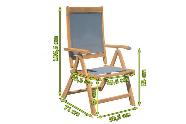 Der Stuhl besteht aus hochwertigem, naturbelassenem FSC-zertifiziertem Akazienholz in Kombination mit Textilene. Die Maße des Klappstuhls betragen ca. 60 x 71 x 107,5 cm. Die besondere Bespannung der Rückenlehne und der Sitzfläche mit Textilene bieten einen zusätzlichen Komfort. Zudem ist die Rückenlehne 5-fach verstellbar und bietet Ihnen somit für jede Gelegenheit eine komfortable Sitzeinstellung. Der Stuhl lässt sich einfach zusammenklappen und somit bei Bedarf platzsparend verstauen. Akazienholz zeichnet sich durch seine natürliche Optik mit eleganter Maserung, seiner Widerstandsfähigkeit und Robustheit aus. Auf Grund der Eigenschaften ist Akazienholz besonders pflegeleicht, sodass Sie kaum Zeit für die Pflege des Stuhles aufwenden müssen.