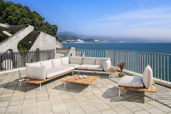 Das Obermaterial dieser Lounge besteht aus hochwertigem Sunbrella Textilen (260g/m²). Das Basismaterial von Sunbrella ist spinndüsengefärbtes Acryl, bei dem bereits bei der Herstellung Farbpigmente in die Faser eingebettet werden. Dadurch ist das Gewebe UV-beständig und trotzt Wind- und Wettereinflüssen. Durch ihre absolute Wetterfestigkeit können Sie die Loungemöbel ganzjährig ohne Schutz auf Ihrer Terrasse stehen lassen – und auch verschüttete Getränke oder dreckige Schuhe machen dem Stoff nichts aus. Auch in puncto Farbechtheit unterscheidet sich Sunbrella vom klassischen Textilgewebe, die Farbe sieht auch nach Jahren in Gebrauch noch aus wie neu. Außerdem weist der Stoff atmungsaktive, schmutzabweisende und schimmelbeständige Eigenschaften auf, weshalb er sich hervorragend für den Innen- und Außenbereich eignet. Das Innere des Polsters besteht aus besonderem Schaumstoff – dem „Quick Dry Foam“. Dieses Material verfügt über eine offenporige Zellstruktur, welche mit der Funktion einer Drainage vergleichbar ist. Eingedrungenes Wasser kann ungehindert austreten und unangenehme Gerüche sowie Schimmelbildung werden vermieden. Je nach Beanspruchung und Umwelteinflüssen empfehlen wir, die Sunbrella Möbel einmal im Monat mit einem Wasserschlauch oder einer sanften Bürste von oberflächlichen Verschmutzungen zu befreien. Pflege- und Reinigungsmittel mit denen Sie Ihre kostbaren Möbel vor Dreck schützen können finden Sie im Zubehör. Der Loungetisch ist aus pulverbeschichtetem Aluminium in Kombination mit schönem Teakholz gefertigt. Dadurch ist der Tisch auch für den Einsatz draußen das ganze Jahr über geeignet. Die Teakablagen links und rechts sorgen für zusätzliche Ablageflächen um zum Beispiel ein kühles Getränk oder Zeitschriften problemlos abzustellen.