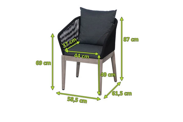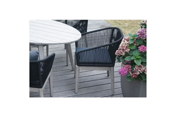 Die Sitzschale ist mit dem flexiblen Material Rope in der Farbe Schwarz bespannt. Das Unterteil des Stuhles besteht aus 100% FSC-Akazienholz in der Farbe grau. Akazienholz zeichnet sich vor allem durch seine Widerstandsfähigkeit und Härte sowie seine elegante Maserung aus. Dieser Diningsessel integriert sich durch die Material- und Farbkombination dezent in alle möglichen Terrasseneinrichtungen. Gemütliche Sitz- und Rückenpolster aus Polyspun (100 % Polyester (250 g/m³)) mit einer Stärke von ca. 6 cm sorgen für höchsten Sitzkomfort. Farblich sind die anthrazitfarbenen Polster perfekt auf die Materialien abgestimmt.