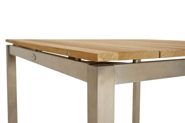 Die Kombination aus Edelstahl und Teakholz sorgt bei diesem ca. 100 x 100 x 75 cm großen Gartentisch aus der Serie „Brooklyn“ von Ploss für ein besonders modernes und zeitloses Design. Die aus SVLK-zertifiziertem Teak gefertigte Tischplatte ist schlicht und mit den breiten Bohlen edel zugleich. Die gebürstete Oberfläche lässt das Holz besonders rustikal und natürlich wirken.