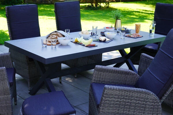 Die Serie Canberra aus dem Hause Ploß überzeugt durch ihre schlichte Eleganz und die hochwertigen Materialien. Das Gestell der Tische besteht aus pulverbeschichtetem Aluminium, welches vor allem durch robuste und langlebige Eigenschaften überzeugt. Die Tischplatte besteht zuverlässigem Keramik-Glas und schafft in Kombination mit dem X-Gestell eine moderne Optik in gedeckten Farben. Zusätzlich überzeugen die Möbel durch ihre Unempfindlichkeit und einen geringen Pflegeaufwand. Die Möbel lassen sich flexibel zu beinah allen Terrassen- und Garteneinrichtungen kombinieren.