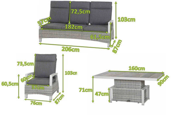 Einfach zurücklehnen und entspannen. Das wetterfeste und pflegeleichte Lounge-Set besteht aus einem Lifttisch mit rechteckiger Tischplatte, einem 3-Sitzer Loungesofa und zwei Loungesesseln. Egal ob Sie die Sonne genießen, ein gutes Buch lesen oder einfach nur gemütlich mit Ihren Lieben gesellig beisammensitzen möchten. Die hochwertigen Sitzmöbel sind wahre Anpassungskünstler und ermöglichen müheloses Entspannen. Die Rückenlehne von jedem Sitzplatz lässt sich ganz einfach über einen Knopf in der jeweiligen Armlehne individuell einstellen, wobei die Verstellung für den mittleren Sofaplatz über eine Schlaufe auf der Sitzfläche geschieht. Das integrierte Hydrauliksystem sorgt für ganz sanft laufende Rückenlehnen. Das Sofa hat ein Gesamtmaß von ca. 87 x 206 x 103 cm. Die ca. 182 cm breite Sitzfläche bietet genügend Platz für 3 Personen oder für ein entspanntes Nickerchen. Die Sessel haben ein Gesamtmaß von jeweils ca. 73 x 87 x 103 cm. Hier lässt es sich auch herrlich entschleunigen. Zusätzlichen Komfort bieten die praktischen Armlehnen aus Aluminium und die Polster in der Trendfarbe stone grey.