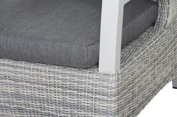 Die verwendeten Materialien sorgen bei Wind und Wetter für den nötigen Schutz. Die Untergestelle der Möbel bestehen aus pulverbeschichtetem Aluminium in matt-weiß-grau und machen sie nicht nur stabil, sondern auch recht leicht. Das Aluminiumgestell wird mit halbrundem GARDINO®-Geflecht aus Polyethylen bespannt. Diese Faser trocknet besonders schnell, ist schmutzunempfindlich und erzeugt mit ihrer natürlichen Optik eine edle und moderne Ausstrahlung. Der „ice grey“ Grauton der Faser verleiht fast jeder Gartengestaltung ein modernes Flair. Die gemütlichen und pflegeleichten Sitzpolster aus 100 % Polypropylen (280 g/m²) sind farblich passend auf das Geflecht abgestimmt. Bei Verschmutzung können Sie die Bezüge abnehmen und von Hand waschen. Erfreuen Sie sich an Ihrer Wohlfühloase, die sicherlich auch Freunde und Familie begeistern wird.