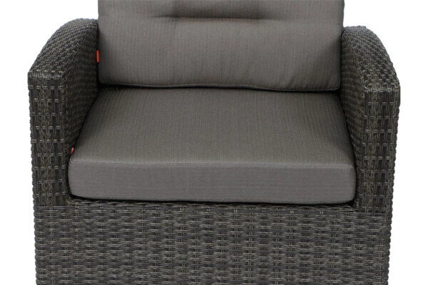 Das Untergestell des Möbelstücks besteht aus pulverbeschichtetem Aluminium, dies macht es nicht nur stabil, sondern sorgt auch dafür, dass es sich aufgrund des relativ geringen Gewichts (ca. 11,06 kg) ganz leicht hin und her stellen lässt. Das Aluminiumgestell wird mit doppelhalbrundem GARDINO®-Geflecht bespannt. Die Basis dieses Geflechts bildet der Kunststoff Polyethylen. Durch die geringe Feuchtigkeitsaufnahme dieser Faser trocknet sie besonders schnell und ist dadurch schmutzunempfindlich. Zudem zeichnet sie sich durch eine natürliche Optik aus und erzeugt eine edle und moderne Ausstrahlung. Der moderne Grauton der Faser passt perfekt zu den meisten Einrichtungsstilen und Gartengestaltungen. Gemütliche Sitz- und Rückenpolster und das gestreifte Dekokissen (100 % Polypropylen (280 g/m²)) sorgen für höchsten Sitzkomfort. Farblich sind die grauen Polster perfekt auf das Geflecht abgestimmt.